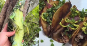 Aprovechando que cientos de iguanas verdes están cayendo de los árboles víctimas del frío, un sujeto aprovecha para sacrificarlas y hacer tacos