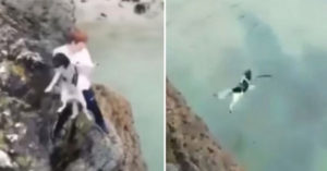 Un video difundido en redes sociales muestra el momento en el que el joven lanza al animal al mar.