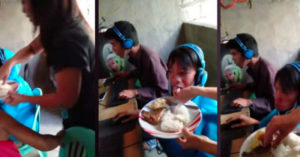 Mamá alimenta a su hijo para que no deje de jugar videojuegos