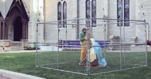Las estatuas fueron colocadas el martes fuera de la catedral episcopal en la céntrica Glorieta de Monumentos y rodeadas por la alambrada.