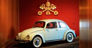 El automóvil de Volkswagen fue construido el 30 de julio de 2003 en la planta de Puebla; está en el Pabellón de Carrozas de los Museos Vaticanos