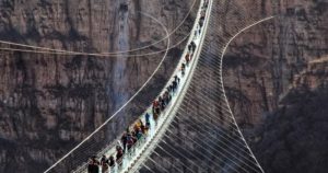 Turistas experimentaron la vertiginosa sensación de pasar por un puente de suelo transparente entre dos acantilados