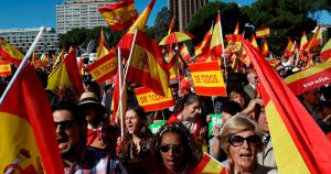 Los manifestantes ataviados con banderas españolas y reunidos en la Plaza Colón gritaban consignas como ‘Viva España’ y ‘Puigdemont a prisión’