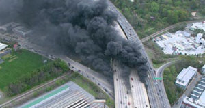 Las llamas han consumido una porción elevada de una autopista, dejando vehículos atrapados a ambos lados del fuego