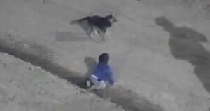 Un video captado por cámara de seguridad muestra a un bebé gateando solo en medio de la noche en un paraje solitario, pero en las imágenes se observa que no está solo, pues su perrito lo acompaña muy de cerca.