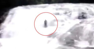 En el clip, se observa cómo, de pronto una figura humanoide aparece ente el agua, sin embargo, al percatarse de que hay personas en el lugar, rápidamente se oculta entre la cascada dejando a la mujer atónita.