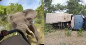 Un hombre que iba en el safari logró capturar el hecho cuando el gran animal embiste un vehículo todo terreno en el que era transportado un grupo de turistas