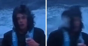 Pese a los destrozos que ocasionó la tormenta ‘Ingunn’, surgió un momento gracioso cuando un pez golpeó a un reportero del clima
