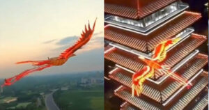 Los ciudadanos de China y los turistas observan asombrados al cometa, pues su parecido con el ave mítica es enorme y a la distancia el artefacto parece auténticamente cubierto en llamas
