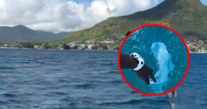 El hombre no pudo contener la emoción ante la escena de ver al mamifero apareciendo a pocos metros de él, justo después de que la bolsa fue retirada del agua
