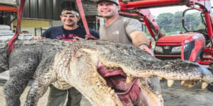 Un grupo de cuatro hombres compartieron en redes que rompieron el récord al cazar a un cocodrilo gigante en el río Yazoo