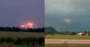 En el video se observan varias luces, al menos 8, que se desplazan en conjunto a lo lejos en medio de un extenso campo al atardecer mientras se aproxima una tormenta.
