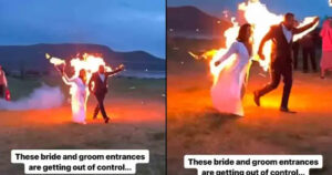 Ardiente entrada nupcial; novios llegan envueltos en llamas y encienden las redes