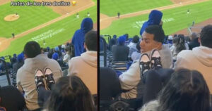La mujer colocó sus tenis en la espalda del joven, quien intentaba disfrutar del evento deportivo en el estadio Citi Field