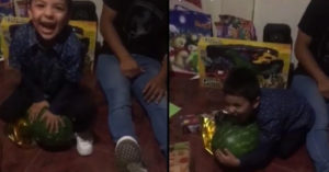 Niño baila de alegría tras recibir una sandía como regalo de Navidad