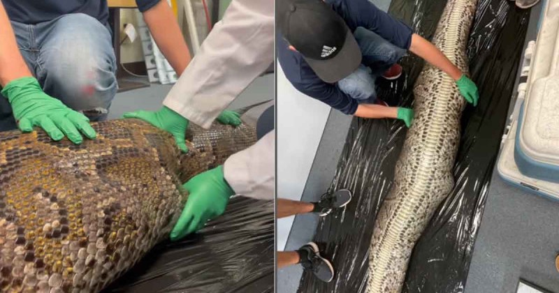 El video se volvió viral en las redes sociales ya que muestra a un caimán de 5 pies sacado del estómago de una pitón birmana de 18 pies encontrada en los Everglades de Florida.