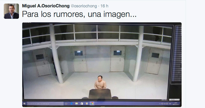 El Secretario de Gobernación, Miguel Ángel Osorio Chong, emitió inusualmente un tuit con una fotografía de Joaquín Guzmán Loera en su celda del penal de alta seguridad de Ciudad Juárez.