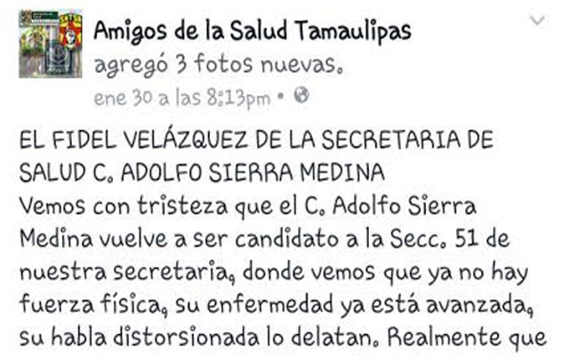 A través de una página en Facebook llamada «Amigos de la Salud de Tamaulipas» que tienen más de 2 mil seguidores señalan que Adolfo Sierra Medina es el «Fidel Velázquez»de la salud