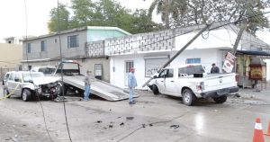 Mujer derriba un poste de concreto y de paso se lleva de encuentro a los dos menores