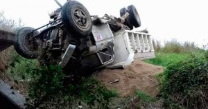 El chofer dice que lo encandiló el Sol, se estrella contra muro central y voltea sobre un costado; 5 pasajeros resultan heridos