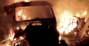 Aparentemente chofer dormita y al salirse del camino cae a un barranco de por lo menos 8 metros. Ante el golpe el camión se quemó