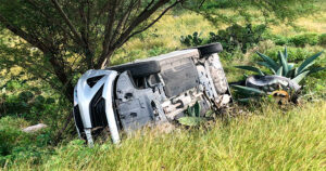 Automóvil con tres personas a bordo vuelca fuera de la carretera vieja a Tula, por fortuna sufrieron solo algunos golpes leves
