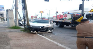 Auto se impacta con poste y lo deja dañado
