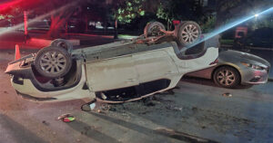 Chofer de una pick up impacta a jardinera de la ‘plaza del 8’ pega a auto estacionado para luego terminar ‘llantas arriba’
