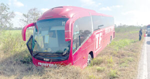 Un camión foráneo de la empresa Transportes Frontera salió del camino a la altura del entronque a Xicoténcatl después de que presuntamente un vehículo lo impactó en el costado izquierdo