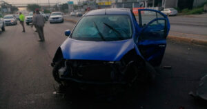 Una conductora omite el señalamiento y provoca un aparatoso accidente abajo del puente elevado, donde dos personas resultan lesionadas.