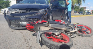 Dos jóvenes salen expulsados de la motocicleta en que viajaban al chocar contra un vehículo que se les atravesó.