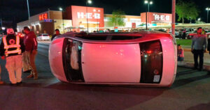 Duelo de dos coches compactos en carriles del bulevar Tamaulipas termina con tres personas golpeadas y un auto volcado.