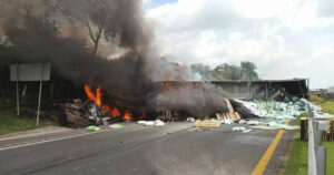 La unidad transportaba sacos de fertilizante y el accidente fue reportado a la C-5 a las 13:00 horas en la carretera Tampico-Mante