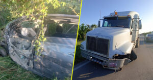 Un tracto camión que arrastraba una plataforma, se estrelló contra un auto sedán cerca del municipio de Aldama