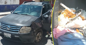 Embarrado por toda la cajuela quedó un pastel, pues la camioneta que lo llevaba fue chocada por un auto que omitió el alto