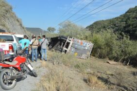 CIUDAD VICTORIA, TAMAULIPAS.- Un operador de tráiler se salvó de morir en una volcadura que tuvo en la carretera Rumbo Nuevo cuando transportaba toneladas de