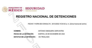 De acuerdo con el Registro Nacional de Detenciones (RND), la captura de Antonio Oseguera se llevó a cabo este martes 20 de diciembre y su estatus se encuentra “en traslado”.