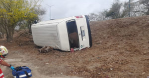 TAMPICO, TAMAULIPAS.- Volcada a un costado de la carretera Tampico-Valles quedó una camioneta, tras salirse del camino, la mañana del jueves. Paramédicos de Cruz Roja