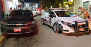 La falta de precaución por parte del oficial, ocasionó que dañara un Chevrolet tipo Aveo, color gris, modelo 2024