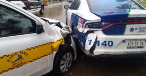 El conductor de un auto habilitado como taxi, se incrustó contra una unidad oficial de Fuerza Tamaulipas, estacionada sobre bulevar Perimetral