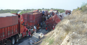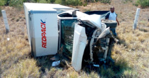 El operador del tráiler pierde el control y cae a un dren pluvial cerca del retén militar del ejido San Antonio de Jaumave