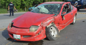 Un vehículo invade el carril y se estrella brutalmente contra la unidad policial, resultando cuatro personas lesionadas, dos de ellos elementos de la División Caminos; frente al ejido El Olivo