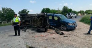 Camioneta tripulada por dos centroamericanos fue impactada de frente y vuelca en la carretera a Reynosa a la altura de Santa Librada