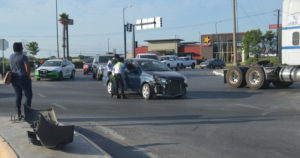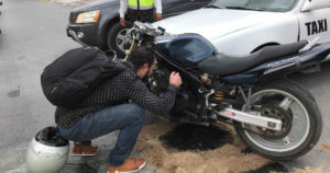 MATAMOROS, Tamaulipas.- Automovilista se pasa el alto en las calles Cuarta y Luis Caballero para impactar moto y llevársela en rastra varios metros, resultando el