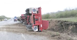 Pierde el control de la pesada unidad que transportaba 25 toneladas de rollos de acero y queda acostado en el kilómetro 71 de la carretera a Monterrey