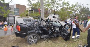 El vehículo volkswagen Jetta registrado en Onappafa circulaba de sur a norte por el libramiento Portes Gil y debido al presunto exceso velocidad pierde el control para terminar impactado contra un poste de la CFE.