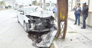 Aparentemente el volante se le endureció, pierde control y se estrella contra torre metálica propiedad de CFE que estuvo a punto de caer en el Fraccionamiento Teocaltiche