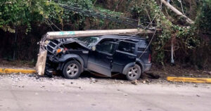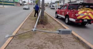 El poste que estaba sobre la banqueta se desplomó tras el impacto de la unidad que aparentemente iba a exceso de velocidad.