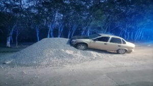 El conductor de un automóvil compacto trepó a un montón de grava luego de derribar la señalética