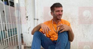 Solo lleva una mochila, un suéter y se sienta en las banquetas donde pone un letrero de cartón donde pide la ayuda de la población y con ello cubrir los gastos del viaje.